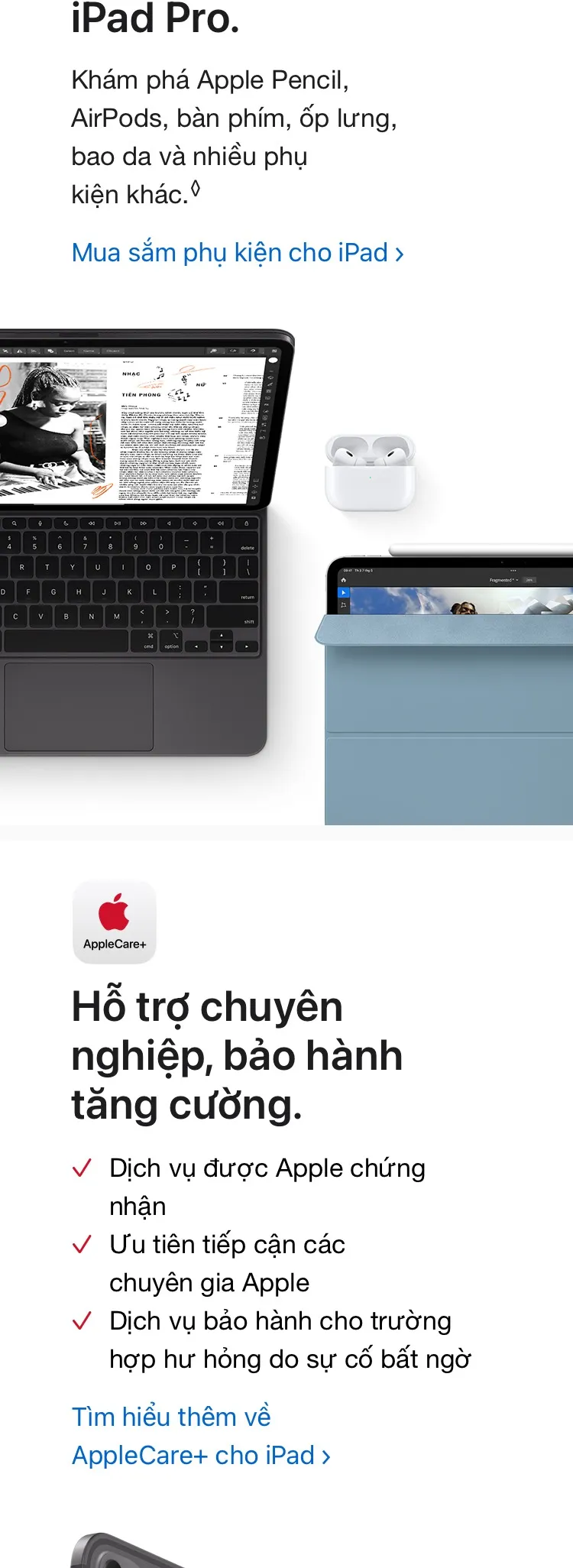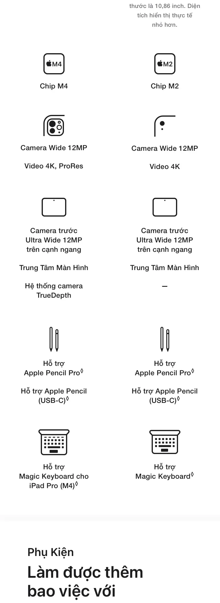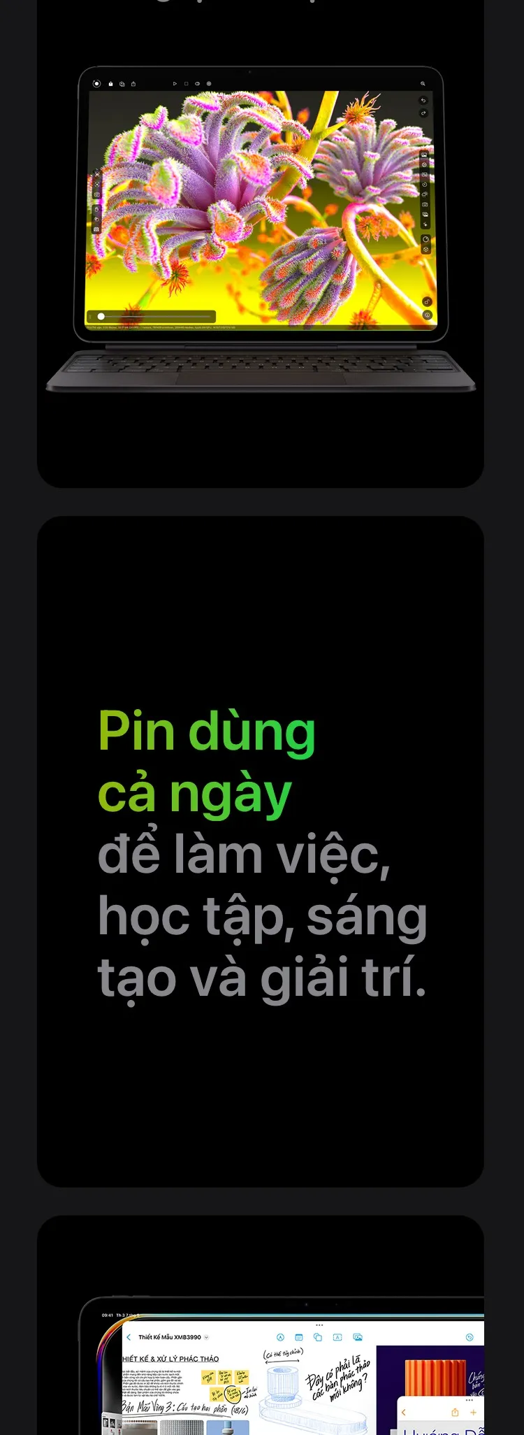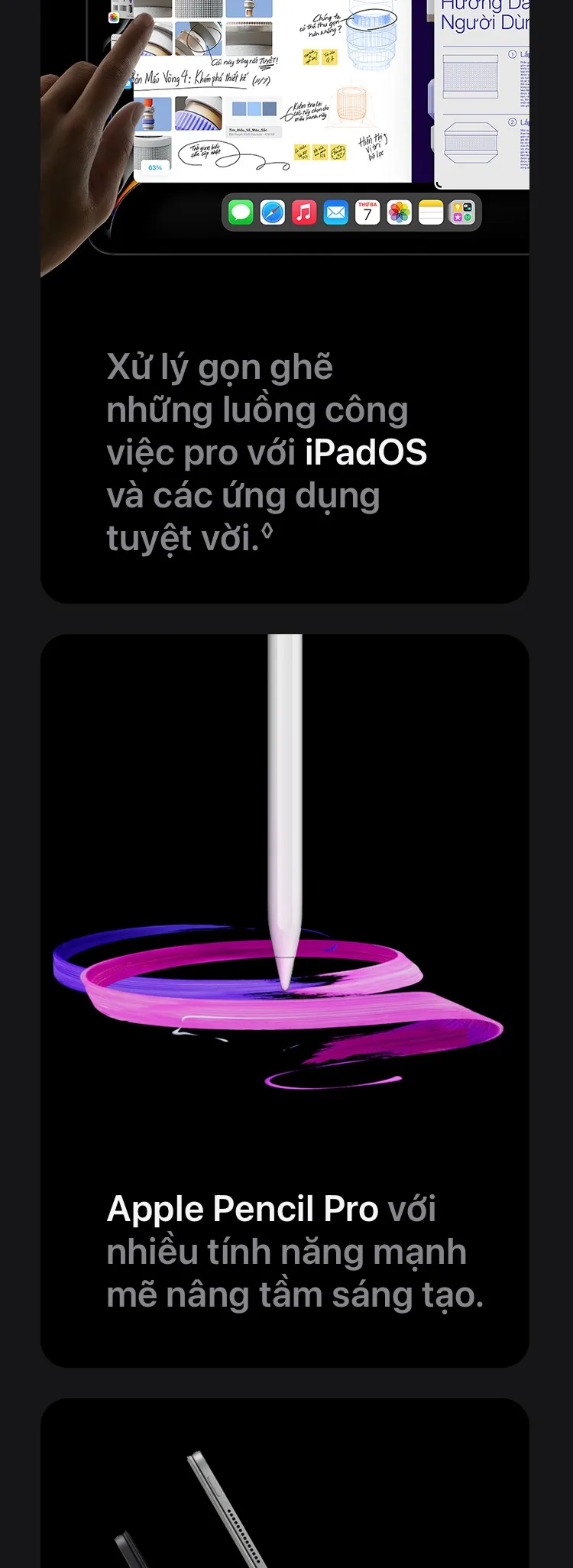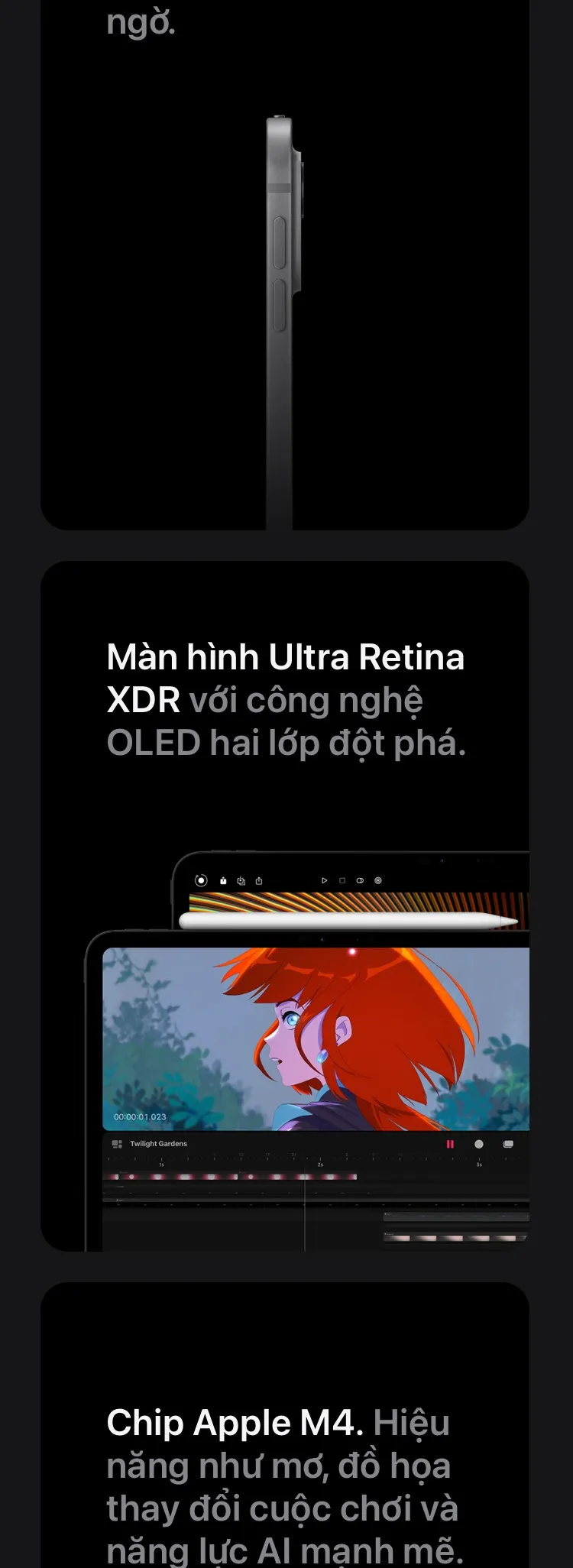 Thiết kế pro hoàn toàn mới. Gọn nhẹ không ngờ.Sản phẩm Apple mỏng nhất từ trước đến nay.Ultra Retina XDR. Màn hình tiên tiến hang đầu.Độ sáng cực đỉnh và độ tương phản chuẩn xác.Giới thiệu chip Apple M4.Hiệu năng như mơ, đồ họa thay đổi cuộc chơi và năng lực AI mạnh mẽ.Xử lý gọn ghẽ những luồng công việc pro với iPadOS và các ứng dụng tuyệt vời.Apple Pencil Pro hoàn toàn mới. Nhiều tính năng mới nâng tầm sáng tạo.1Magic Keyboard được thiết kế mới, mỏng hơn. Trải nghiệm gõ phím và bàn di phản hồi cảm ứng cực kỳ thoải mái.1