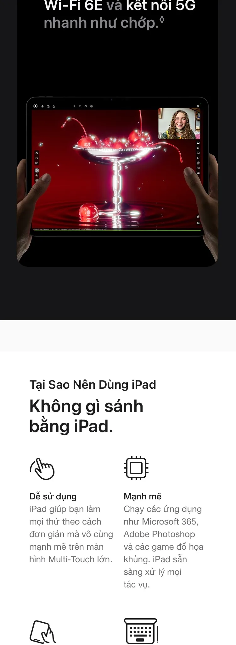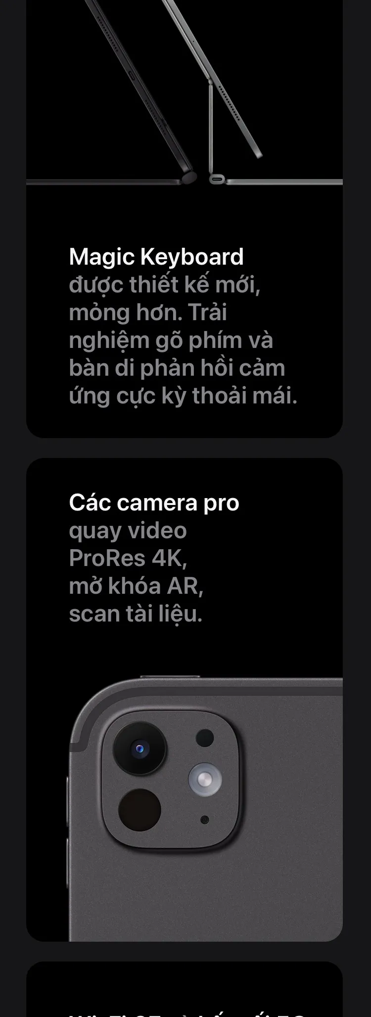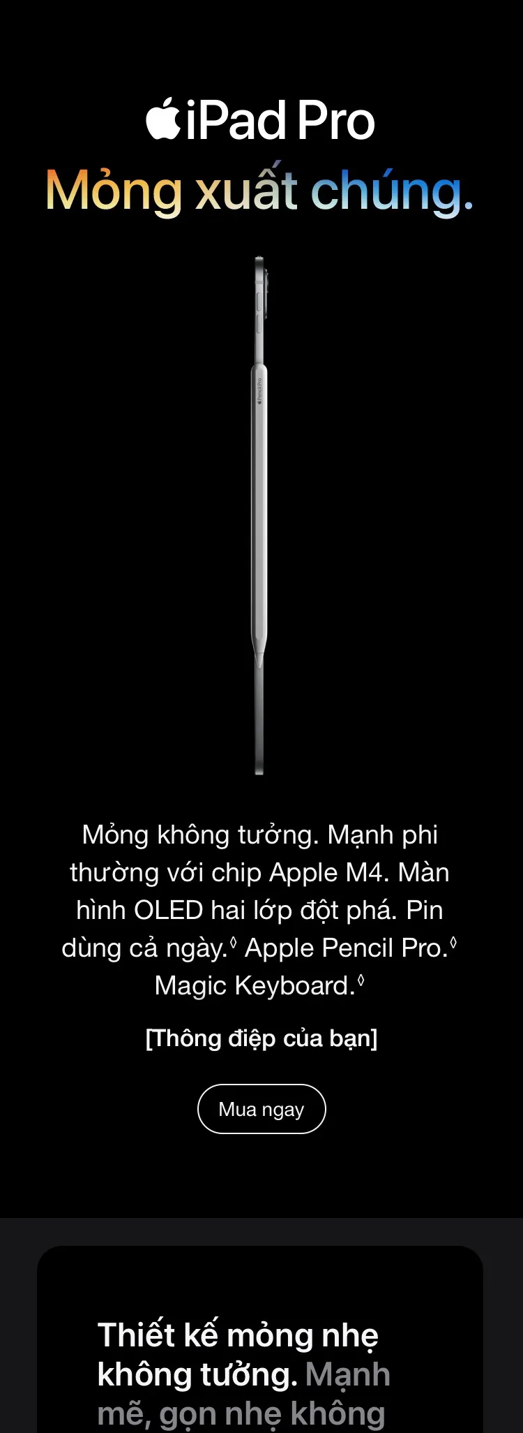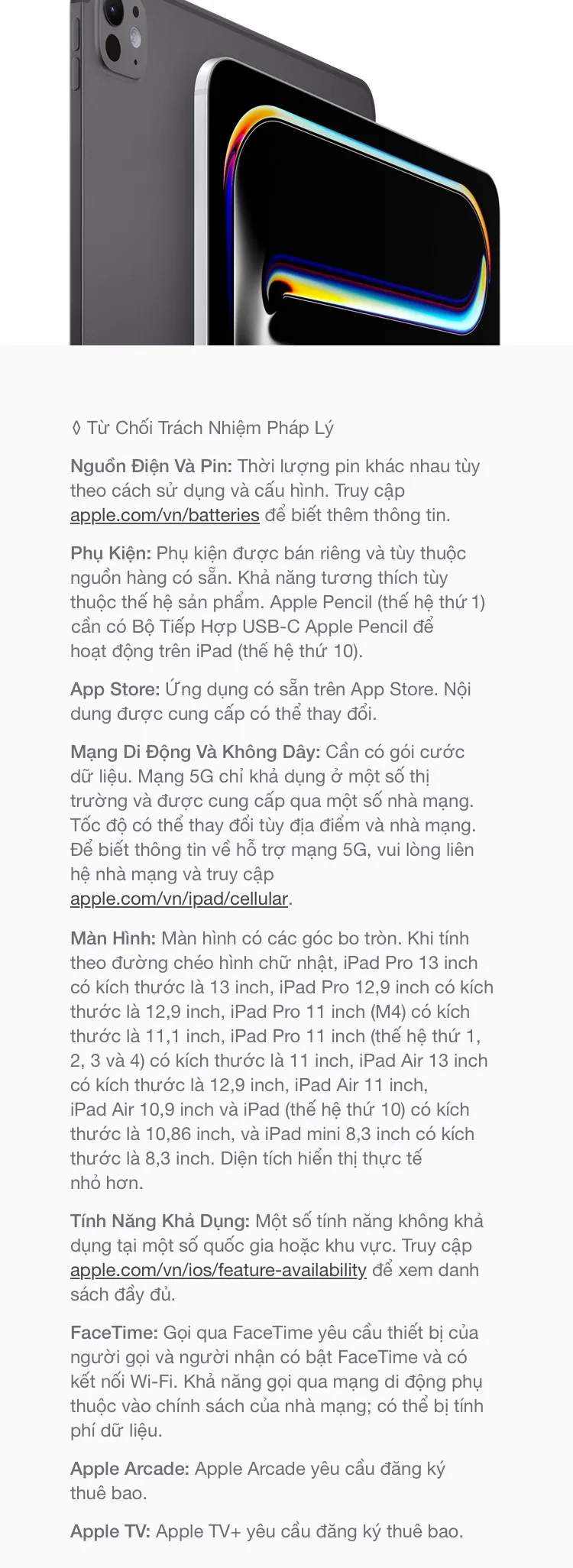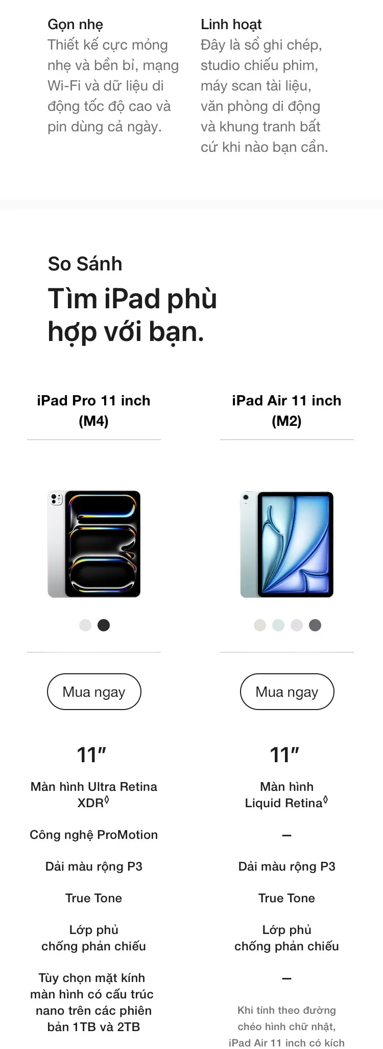 Thiết kế pro hoàn toàn mới. Gọn nhẹ không ngờ.Sản phẩm Apple mỏng nhất từ trước đến nay.Ultra Retina XDR. Màn hình tiên tiến hang đầu.Độ sáng cực đỉnh và độ tương phản chuẩn xác.Giới thiệu chip Apple M4.Hiệu năng như mơ, đồ họa thay đổi cuộc chơi và năng lực AI mạnh mẽ.Xử lý gọn ghẽ những luồng công việc pro với iPadOS và các ứng dụng tuyệt vời.Apple Pencil Pro hoàn toàn mới. Nhiều tính năng mới nâng tầm sáng tạo.1Magic Keyboard được thiết kế mới, mỏng hơn. Trải nghiệm gõ phím và bàn di phản hồi cảm ứng cực kỳ thoải mái.1